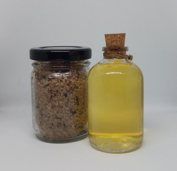 1 Botella de vidrio con 100 ml de Espuma y 1 Frasco de vidrio 100 gr. con Sales